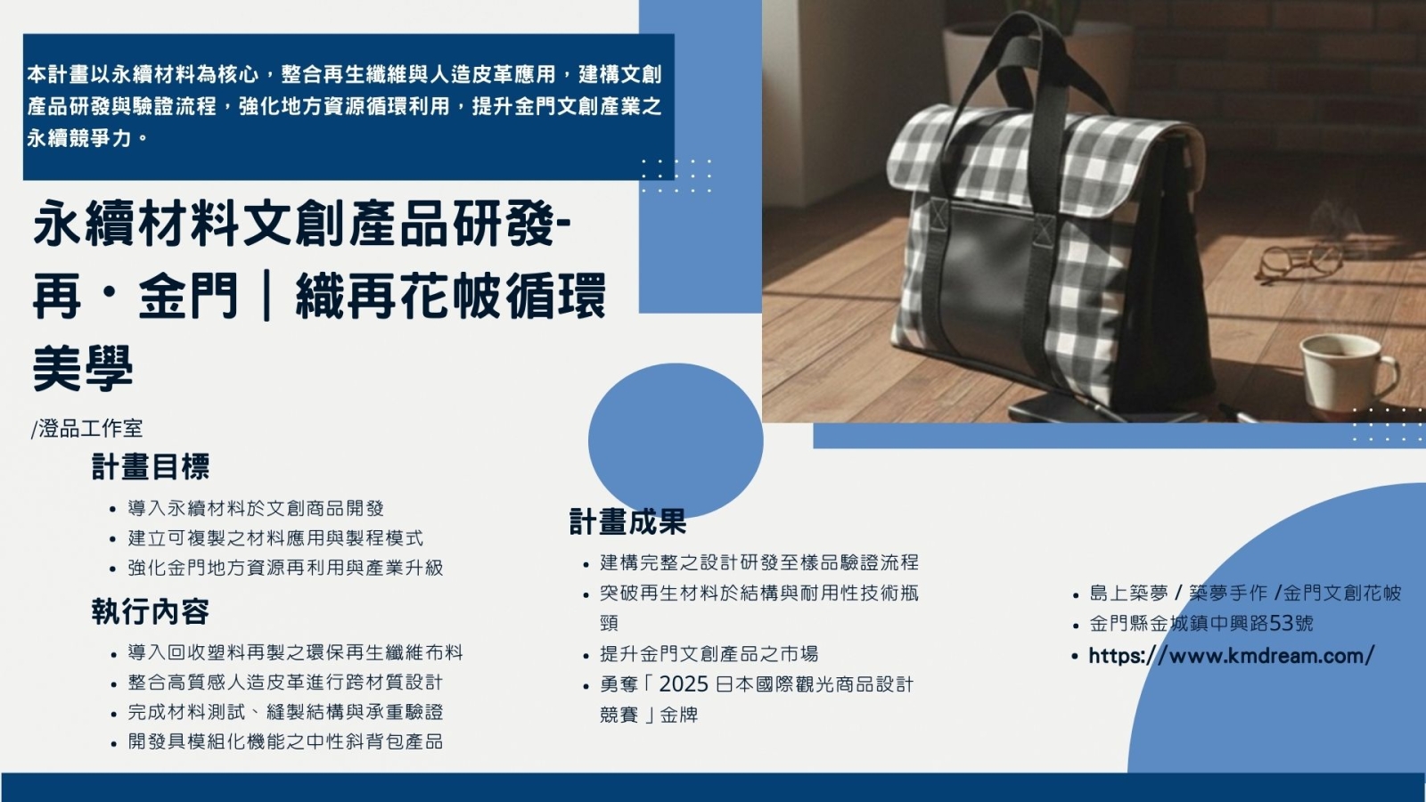公司簡介 澄品工作室於109年成立,品牌負責人最早於103年因為家庭來到金門開展事業,在剛來到金門的那一刻就深深的被金門花帔給打動,從此愛上花帔文化。 計畫成果 創新材質應用與傳統文化圖騰再設計,提升地方資源的再利用價值,並打造兼具美感、實用與永續精神的特色商品。 -------------------------------------------- 公司名稱:澄品工作室 電話:0987-359-130 地址:金門縣金城鎮中興路53號
