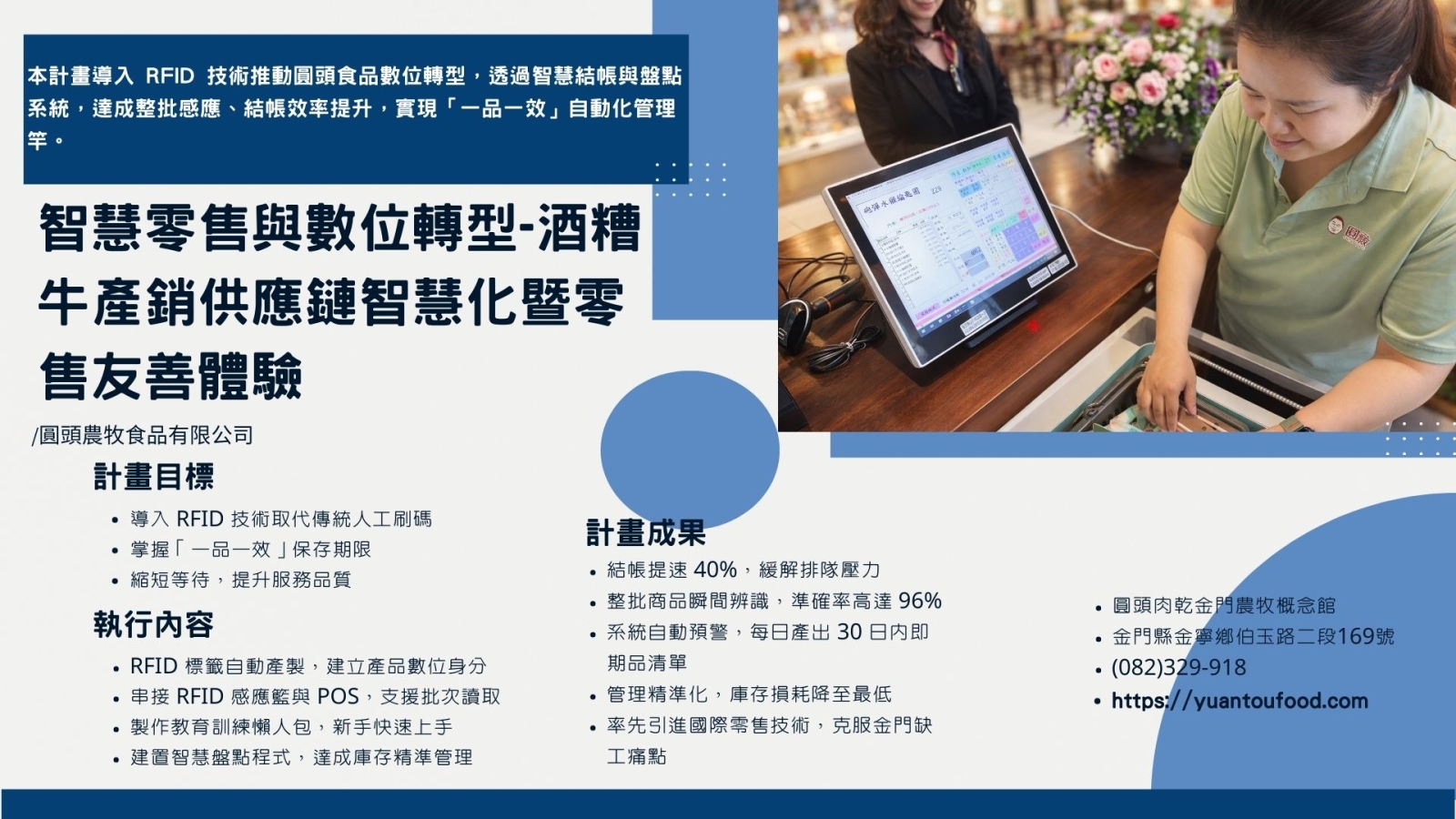 導入智慧識別系統與POS整合,將生產到門市流程數位化,解決結帳與倉儲人力缺口,降低營運損耗,建立金門連鎖產業數位轉型示範標竿。